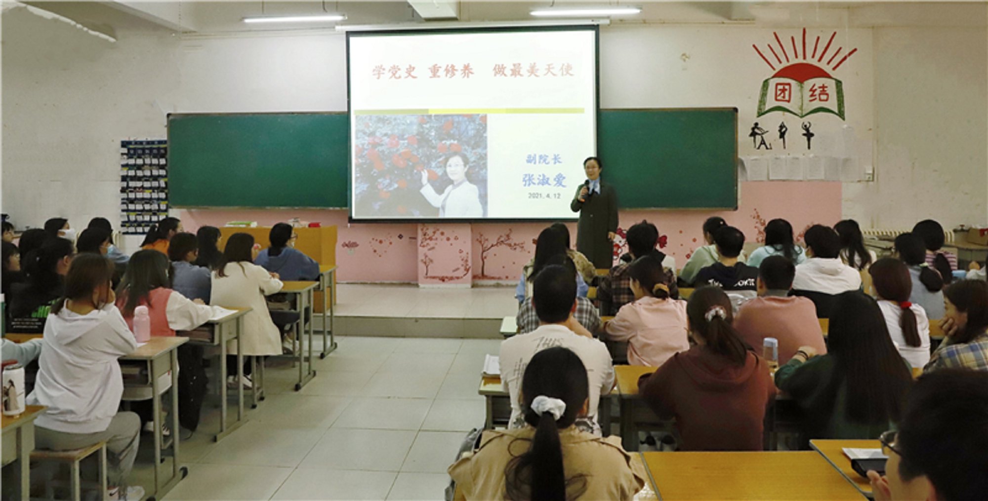 根据学院党委关于《学党史、强信念、育新人》党史学习教育的部署,4月12日,学院副院长张淑爱在二号教学楼102教室对2020级护理2班和2020级护理4班的学生上了一堂题为“学党史,重修养,争做新时代最美天使”的专题党课。