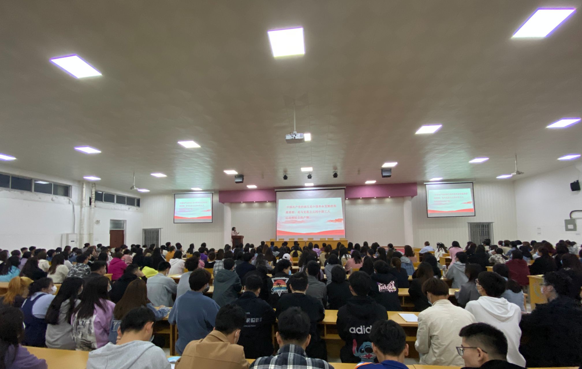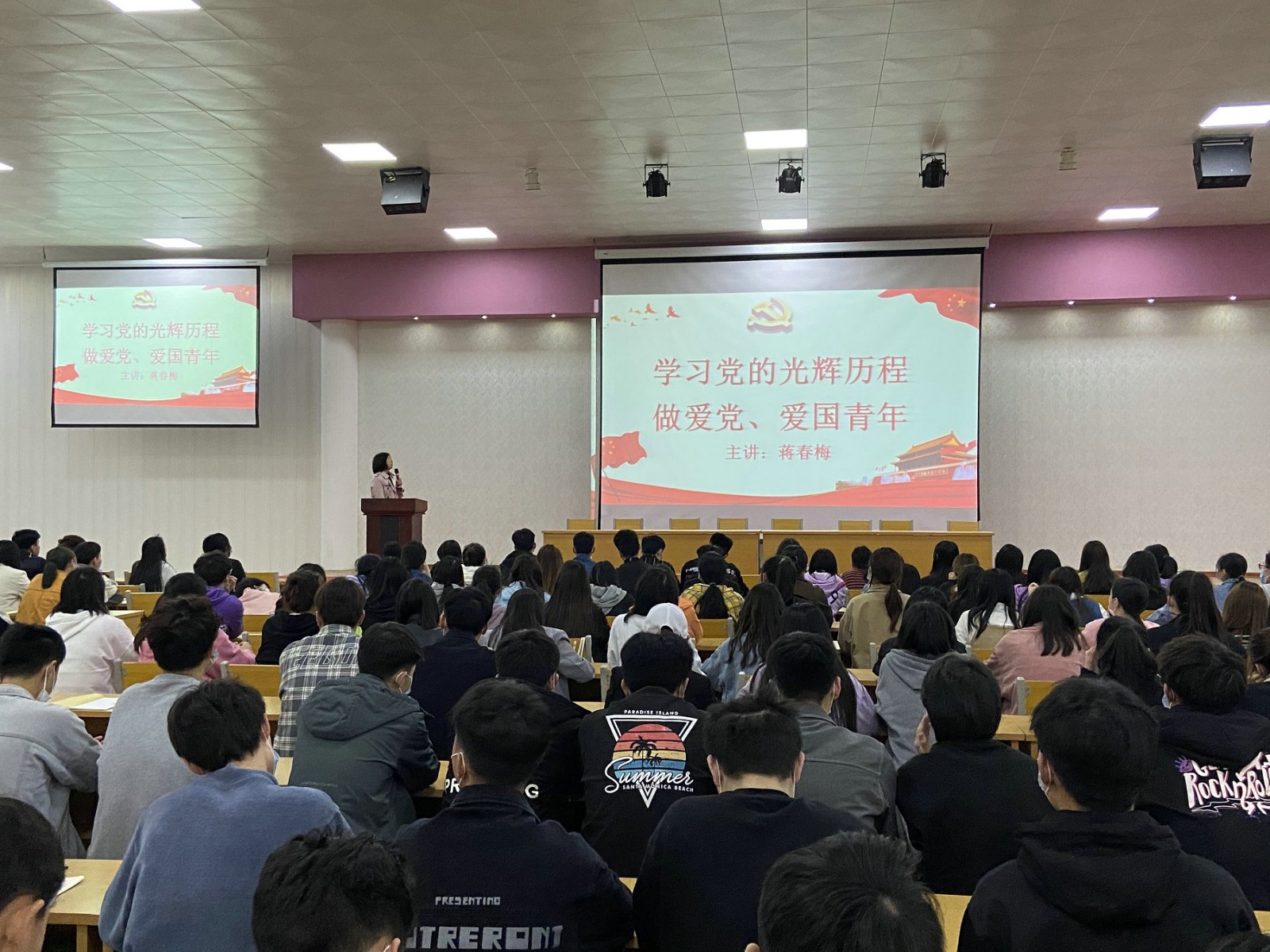 蒋书记通过对中共一大到中共十九大的革命事迹的讲解,用"红船精神"、邓小平语录等具体内容向同学们生动展现了革命前辈开辟新路时“敢为人先"的气魄和胆识,勇往直前、百折不挠的勇气和毅力。正是有了伟大的中国共产党,才有了如今的和平时代,快速发展的经济时代。党领导人民在过去的100年里写下了光辉篇章,也一定能够在新时代继续谱写出更加壮丽的篇章,将继续推进社会主义现代化建设,完成祖国统一大业,维护世界和平与促进共同发展。