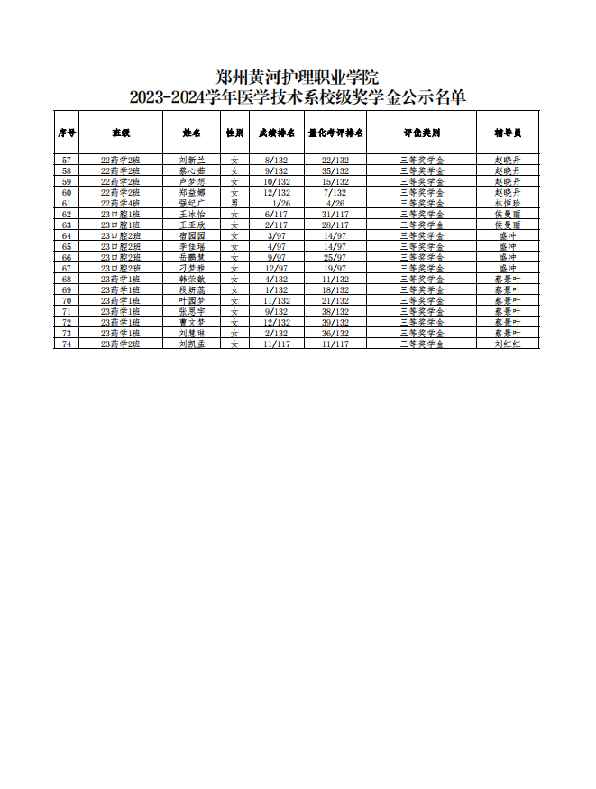 2023-2024学年医学技术系校级奖学金公示名单