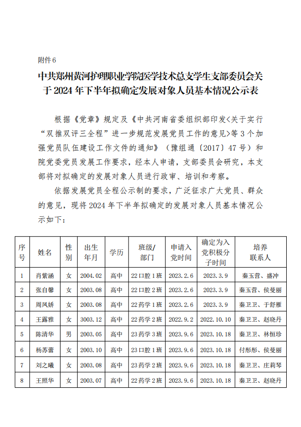 中共太阳成集团tyc33455cc医学技术总支学生支部委员会关于2024年下半年拟确定发展对象人员基本情况公示表